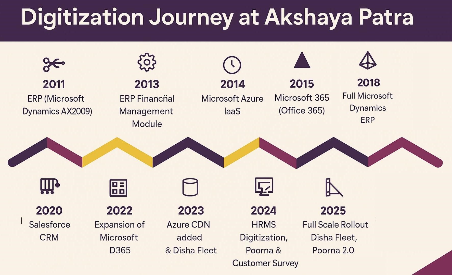 Akshaya Patra undertook a comprehensive digital transformation via "Project Disha" (Distribution Excellence) and "Project Poorna" (Production Efficiency). This involved implementing Microsoft Dynamics ERP as its backbone, leveraging Azure for scalable infrastructure, and deploying tailored mobile applications (PowerApps, OS1) and specialized systems (Kelsa, Zing HR) to digitize end-to-end supply chain operations, from order management to last-mile delivery and kitchen production.